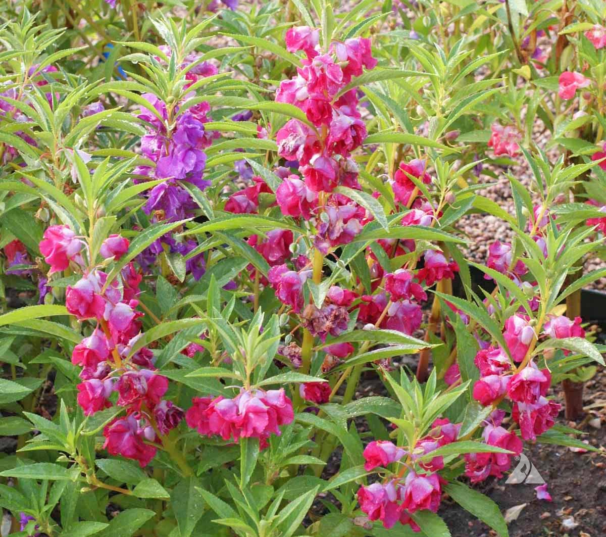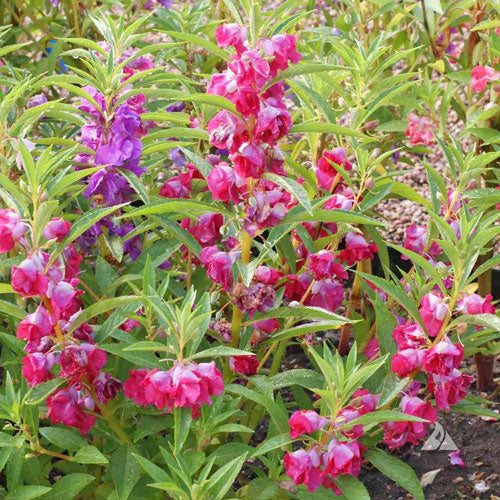 This relative of the balsam and the busy Lizzie deserves its own spot in the garden. They like a lot of moisture, which you can tell from the watery stems, and they can also do with a little less sun. The fast flowering and bright colours (white, pink, lilac and red) bring the gloomiest corner to life! The flowers are usually (semi)double, can grow up to 5 cm in diameter and look like Camellias. Although the plant sows easily (seeds shoot metres away), it is not a rampant plant. Height 40-50 cm.