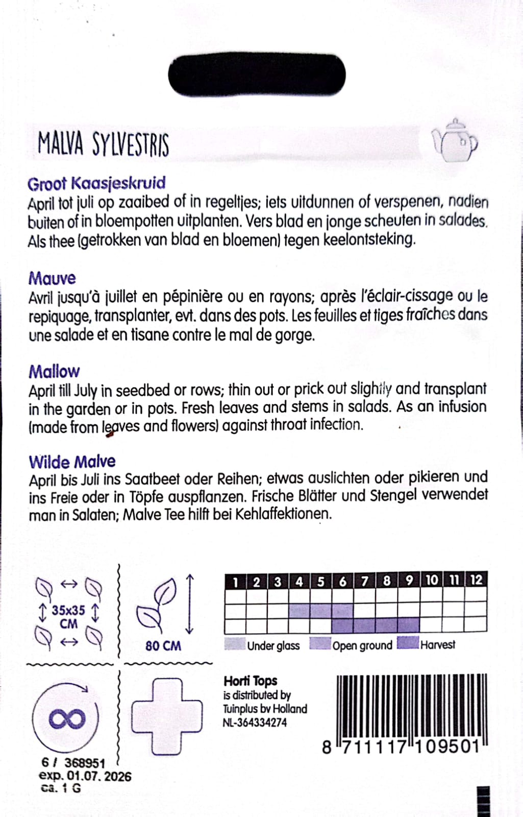 April to July in seedbeds or in rows; thin out or prick out a little, then plant out outdoors or in flower pots. Fresh leaves and young shoots in salads. As a tea (made from leaves and flowers) against sore throats.